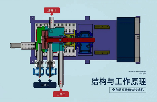 • 物料從入料口進入熔體腔,經過濾板過濾,不同目數合格的物料從出料口流出